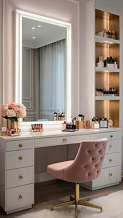 Walking into this makeup room is like stepping onto your own personal movie set, complete with all the glam! Those super bright, Hollywood-style lights around the mirror aren’t just for show; they’re like your secret weapon against bad lighting, making sure your eyeliner is always on point and your foundation blends seamlessly. No more trying to do your makeup in a dimly lit bathroom, squinting at your reflection! Plus, look at all that clever storage on the sides. Every lipstick, brush, and palette has its own cozy, organized spot, proving that even your makeup deserves a tidy home, unlike the mystery zone that is sometimes your locker.