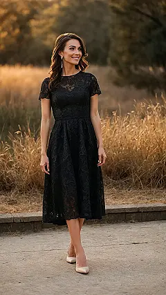 Finding the perfect wedding guest outfit can feel like a super secret mission, right? You want to look amazing, but definitely not so amazing that Grandma thinks *you’re* the one getting married. This classic black lace dress, like the one our model rocks, is pretty much a superhero cape for such occasions. It says, “I put effort in, I’m here to celebrate, and I absolutely promise not to spill grape juice on the bride’s dress.” Plus, black is always in, making you look effortlessly chic without trying too hard – which is exactly the vibe you want when you’re about to tear up the dance floor.