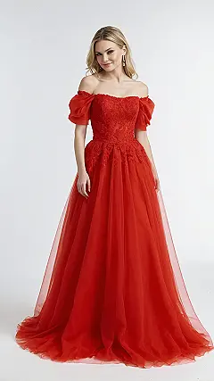 Who says wedding dresses have to be white? This gorgeous, fiery red gown is ready to rewrite the rulebook and make a seriously bold statement! With its elegant off-the-shoulder cut and layers of tulle adorned with intricate lace patterns, it’s basically an invitation to feel like royalty – or perhaps a super cool rockstar bride. Choosing a dress this vibrant isn’t just a fashion choice; it’s a declaration that your big day is going to be unforgettable, full of personality, and definitely not boring!