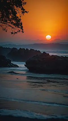This picture is like a postcard from a dream! The sky is painted in shades of orange and pink, like a giant, melting lollipop. It’s so bright, it’s almost blinding, and the sun looks like a giant, glowing marshmallow, about to drop into the ocean. In the foreground, you’ve got these big, chunky rocks that look like they’re just chilling, enjoying the show. The waves gently lap against the shore, creating a soft, soothing sound that’s perfect for a quiet moment of relaxation.