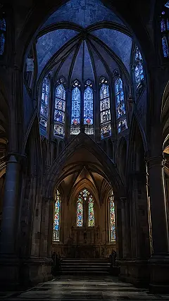 Gothic architecture is all about being dramatic and grand, just like this building. It’s not just about how it looks though. You can really feel the power of the church in the image. Even though it looks a little dark inside, it’s kind of cool how the light shines through the stained glass and makes it feel special. It’s like stepping into a different world, one full of stories and mystery.