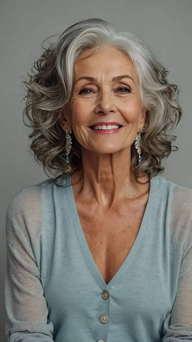 This woman’s got style! Her hair is amazing – it’s like a whole bunch of layers stacked on top of each other, with bouncy curls that look super soft. And guess what? It’s all natural, with silver streaks that make her look super cool and confident. You know, it’s like she’s saying, “I’m not afraid to embrace my age, and I’m totally rocking it!”