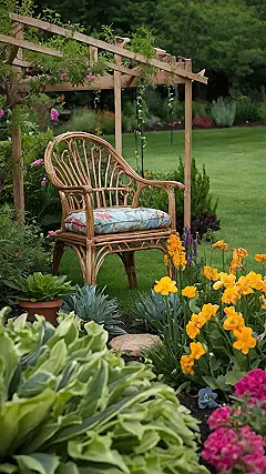 This garden has everything: colorful flowers popping up everywhere, a comfy-looking chair just waiting for you to sit with a book, and even a cool wooden structure for plants to climb on. It’s like a secret hideaway designed by Mother Nature and some super creative human, where you can just kick back, enjoy the sunshine, and forget about all your homework assignments. What a stunning way to use the space.