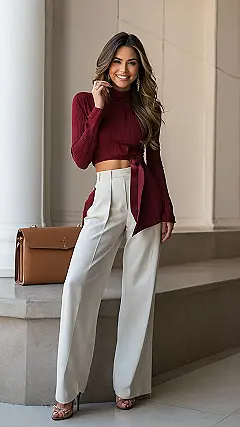 This woman is rocking the fall fashion game with her cute outfit. She’s got a comfy red sweater that’s tied in a way that makes her waist look super tiny. And those pants! They’re so flowy and make her look like she’s walking on a runway. And let’s not forget the heels! They’re the perfect touch to complete this stylish look. You bet she’s going to turn heads in this outfit! She’s ready to conquer the world, and she’s got the perfect outfit to do it in. Maybe she’s on her way to a big meeting, or maybe she’s just grabbing coffee with friends. Whatever she’s doing, she’s doing it in style.