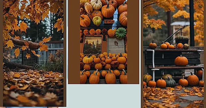 This picture is like a cozy autumn dream! It’s got all the best parts of fall: pumpkins, leaves, candles, and even a little bit of rustic charm. The pumpkins are like little orange smiles on the porch, and the leaves look like they’re falling right out of the trees and onto the wooden floor. You can almost smell the crisp fall air and hear the crackling fire inside. It’s the perfect place to curl up with a good book and a cup of hot cocoa, and just enjoy the beauty of the season.
