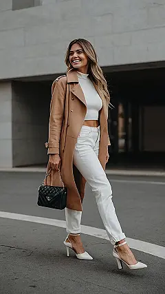 This outfit screams “I’m ready for fall, but not ready to give up summer vibes just yet!” It’s a classic look, with the cozy trench coat adding a touch of warmth while the white jeans keep things bright and airy. It’s like the fashion equivalent of a pumpkin spice latte ‚Äì a little sweet, a little spicy, and totally perfect for the season.
