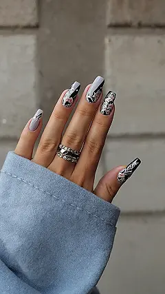 These nails are giving major fall vibes! They’re like a bouquet of flowers on your fingertips, but instead of smelling amazing, they just look amazing. The black and grey base is like the crisp air of fall, and the pink and white flowers are like the last beautiful blooms of the season. Imagine you’re wearing these to a pumpkin patch – you’d be the most stylish pumpkin picker in the patch!