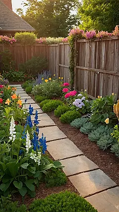 This garden is like a magical place where flowers put on a dazzling show! Imagine walking along a pebble path, like a tiny river of colorful stones, past flowers bursting with colour. It’s a total flower party happening here, with sunny yellows, fiery reds, and calm purples all getting along perfectly – it’s almost too good to be true! There are even cute little wooden stepping stones, just waiting for tiny fairy feet (or yours!).