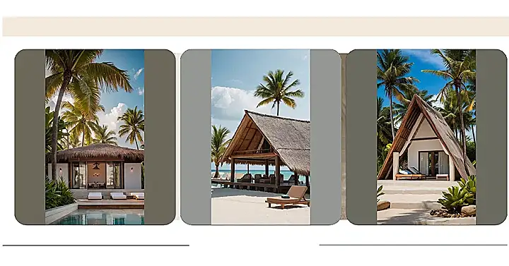 This resort design is like if a fancy camping tent and a cozy beach house had a baby! It’s got this super cool A-frame roof, probably to keep the sun off or maybe for epic rain dances (if that’s your thing). Either way, with those palm trees waving in the background, you know you’re in for some serious relaxation. Just imagine chilling on that deck chair, sipping a coconut drink, and finally finishing that book you started like, six months ago!