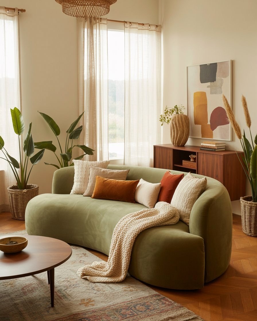 Discover tranquility in this sage green living room, a perfect fusion of modern boho style and classic mid-century charm. A comfortable interior is created with natural textures and earthy, warm tones.