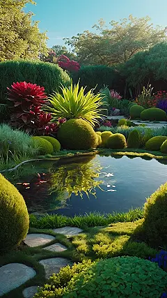 This garden is so secret, even the pond is hiding! Look at all those mossy rocks and leafy plants, it’s like a magical jungle! And just when you think it’s just a bunch of green, BAM! You find a bright red flower that pops out like a superhero cape! It’s like the garden is playing hide-and-seek with your eyes, and it’s winning.