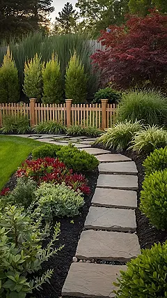 So, you’ve got a property line, huh? Instead of building a boring fence like everyone else, why not throw a party for your plants! This picture shows how to make your property line the coolest hangout spot in the neighborhood. Forget awkward neighbor encounters over errant frisbees; just invite them over for a stroll down your stone path, surrounded by happy bushes and flowers.