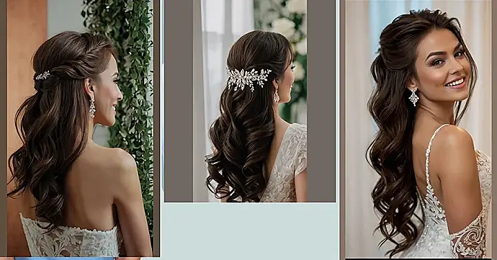 This hairstyle is a classic for a reason! It’s like the perfect blend of “fancy” and “casual.” The curls look super glamorous, but they also kinda remind you of the way you look after a good hair wash. The hair’s been styled so it falls nicely down the back. It’s like a waterfall of gorgeousness! The little sparkling hair accessories are just the right amount of bling—not too much, not too little. It’s like the hairstyle is saying, “I’m here to party, but I’m also here to look amazing!”