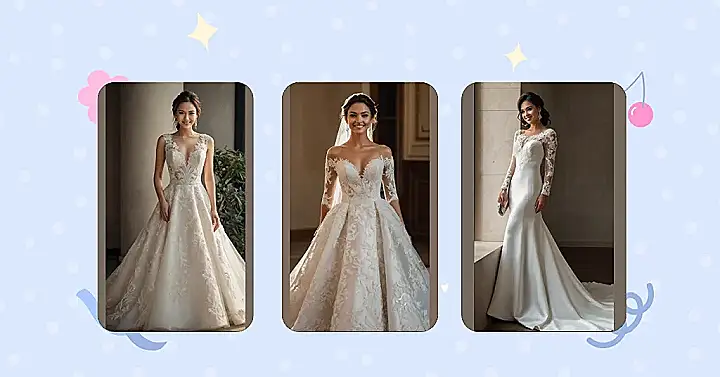 With its romantic off-the-shoulder sleeves and stunning lace detailing, this dress is the epitome of bridal elegance. It’s totally dreamy and would make anyone feel absolutely amazing on their big day. Forget about stress- just picture yourself walking down the aisle, feeling confident and beautiful in this masterpiece. It’s more than just a dress; it’s a statement, a memory waiting to be made, and a perfect example of how new bridal dress designs are seriously stepping up their game!