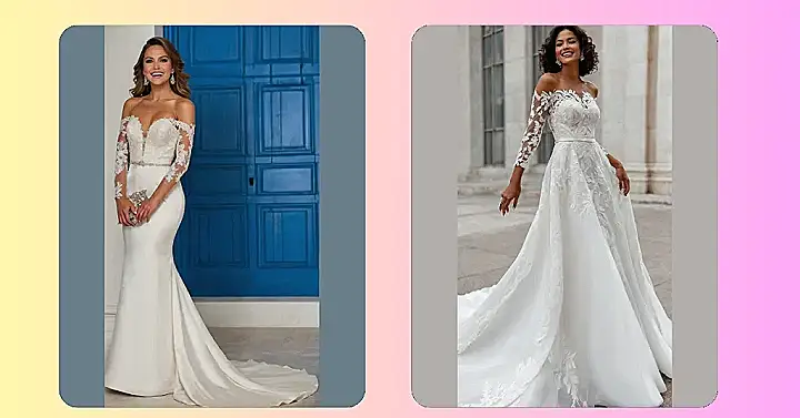This dress is the perfect example of “off-the-shoulder wedding dresses” done right! It’s got that romantic, whimsical feel that would be perfect for a garden wedding, a castle wedding (like in the picture!), or even a super fancy ballroom. It’s so pretty it almost makes you want to plan a wedding just so you can wear it! Plus, imagine all the awesome photos you could get in a dress this beautiful – and it’s got long sleeves, which is perfect if you’re getting married when it’s a little chilly. Seriously, wedding dress goals!