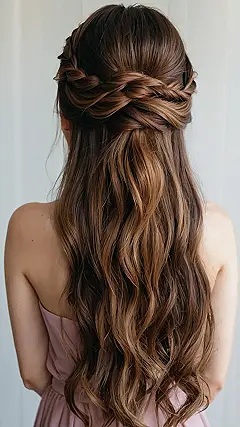 Being a bridesmaid is all about looking amazing, and this hairstyle is the perfect way to achieve that! It’s a blend of fancy and fun, kind of like the wedding itself. Imagine this – you’re getting ready with the bride, your hair is already done, and it looks like it’s straight out of a magazine. The braid around the crown is so cute and adds a little touch of sophistication. It’s like a crown, but made out of your own hair! Plus, the loose curls make you look totally glamorous.