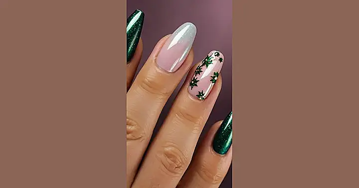 Seriously, could these nails be any cuter? They’re the perfect blend of elegant and playful – imagine wearing these to a winter dance or even just lounging around the house feeling fancy. The green is like a snowy evergreen tree, and those gold flakes are like the presents under it, waiting to be opened. This manicure is a definite mood booster, and it’s so festive that it’ll make you want to sing Christmas carols (even if you’re tone-deaf!).