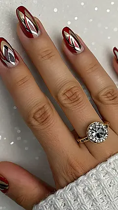 These nails are totally festive! Look at those gorgeous red and gold swirls – they’re like a fancy Christmas ornament, but for your fingers. They’re perfect for cozying up by the fireplace with hot cocoa and a Christmas movie, or maybe even hitting the slopes (just try not to chip them!). Imagine rocking these while opening presents – you’ll be the most stylish elf in town!