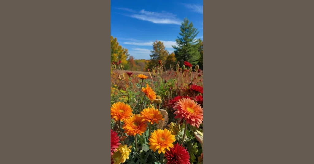 Now picture these vibrant flowers in their autumnal glow. They’re the stars of the show, reaching for the sky like little ballerinas in a graceful dance. The sun, like a spotlight, catches them just right, making them sparkle and shine. You almost expect them to burst into a beautiful melody, a symphony of sunset hues played by nature itself. It’s like the world is saying, “Look at me! I’m still beautiful even though it’s getting colder.” And who could argue with that? It’s enough to make anyone smile!
