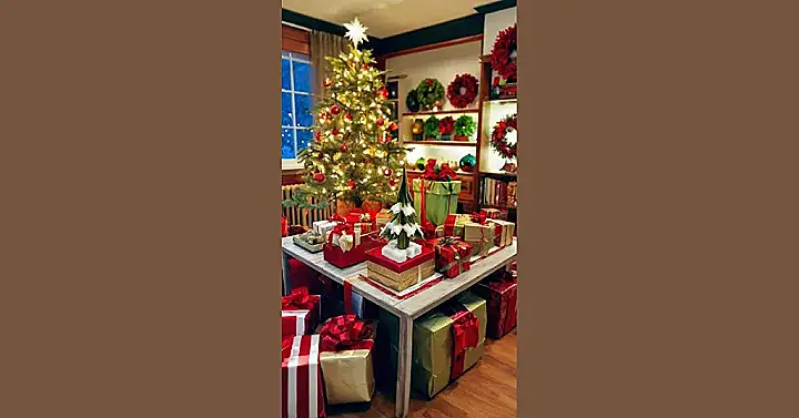 **Paragraph 1:** Wowzers! Check out this Christmas room decor! It’s like stepping into a holiday postcard. There’s a super-festive wreath, practically bursting with gold and red, that’s bigger than my head! And look at that console table— it’s overflowing with presents, sparkly mini-trees, and even Santa himself (or maybe a really convincing lookalike) snuggled up in his stocking. The whole thing is seriously decked out, making you want to instantly grab a hot chocolate and curl up by the fireplace.
