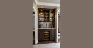 Step into a living room that exudes a rustic charm so palpable, you can almost smell the woodsmoke and hear the crackle of autumn leaves underfoot. Soft grey walls serve as the perfect backdrop to accents of deep forest green and warm mustard, infusing the space with a cozy, woodland-inspired ambiance. Envision sinking into a generously-sized sofa, adorned with plush cushions in shades of copper and chestnut, the room alive with the essence of nature’s bounty. As you gaze around the room, you’re struck by the harmonious blend of textures and colors that seamlessly blend modern comfort with timeless rustic allure, creating a space that feels both inviting and sophisticated.