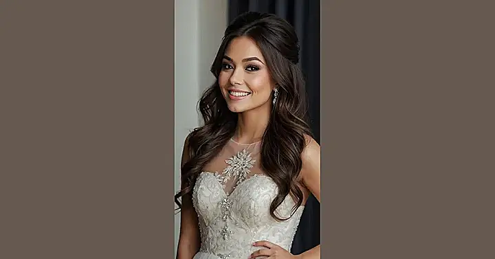 Hey there, future prom queen or blushing bride! Check out this awesome hairstyle – it’s half up, half down, which is totally trendy right now. Imagine this: you’re walking down the aisle (or into the school dance!), and your hair is doing its own little party. It’s got that perfect balance of elegance and fun, like a sparkly unicorn riding a rollercoaster. That gorgeous hair clip? It’s like adding the cherry on top of a super delicious sundae— making the whole look even more fantastic!