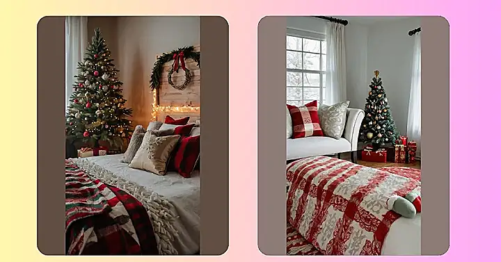 This bedroom is all decked out for the holidays! With a glowing Christmas tree in the corner, a festive wreath on the headboard, and cozy blankets, it’s the perfect place to snuggle up and get into the Christmas spirit. You can tell Santa’s been busy decorating here, with plaid blankets and sparkly pillows. And the string of lights? Pure holiday magic! It looks like this room is ready for a magical Christmas night.