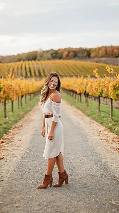 This girl is ready to sip some wine and enjoy the beautiful fall colors! Her cute white dress is perfect for a day at the winery, and those boots are just the right amount of trendy and comfy. You can tell she’s ready to have a good time, and who wouldn’t be with such a stunning backdrop? It’s the kind of outfit you can wear to a tasting, a vineyard tour, or even just a picnic under the autumn trees. She’s definitely got the fall fashion game on lock!