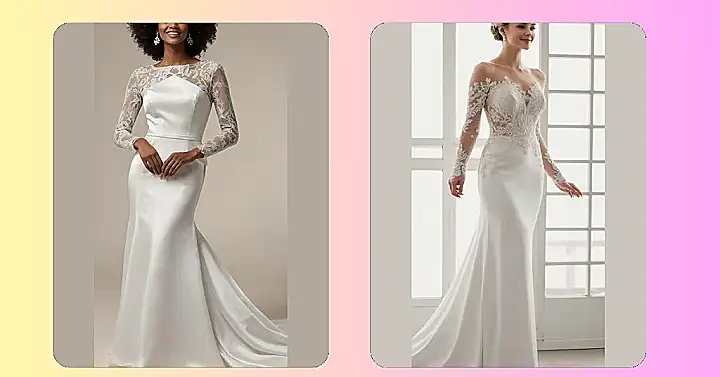 This wedding dress is seriously stunning! It’s a “sheath silhouette,” which means it hugs your curves like a comfy hug from your grandma (but way more stylish). The satin is super sleek and sophisticated, but the lacy long sleeves add a touch of whimsy. It’s like a fancy mermaid tail meets a cozy sweater – talk about the best of both worlds! You’ll feel like a total princess, but one who’s ready to dance all night long.