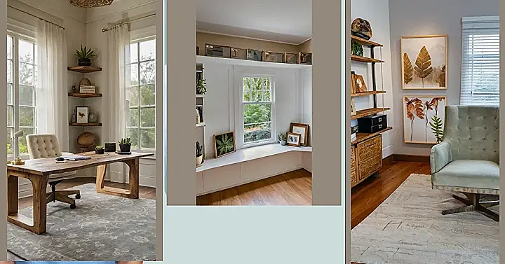 Imagine acing that history assignment while chilling in this comfy chair. It’s like your very own thinking throne! This home office design mixes serious study vibes with a touch of nature. Who wouldn’t want to brainstorm ideas surrounded by leafy art and a view from the window?