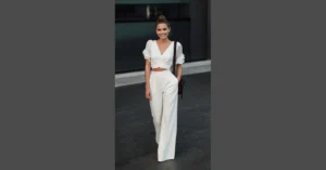 This outfit screams “I’m ready to take on the world!” It’s simple, yet stylish, and makes you look like you just stepped out of a magazine (without the awkward photoshoot poses). The all-black ensemble is a classic choice, making it perfect for any occasion, from a casual coffee date to a fancy dinner. The cropped top is super trendy, and the wide-leg pants give off an effortlessly chic vibe. Plus, let’s be real, who doesn’t love a good pair of sparkly heels? They’re the perfect finishing touch for any classy outfit, and they’ll definitely make you stand out from the crowd.