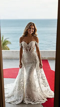 Alright, so picture this: you’re about to make your grand entrance, possibly walking down an aisle that’s basically a red carpet leading to the ocean, and you’re rocking *this* classic bridal dress. It’s got lace that probably took someone ages to sew, a train that goes on for days (great for dramatic exits, terrible for tripping), and enough sparkle to make the sun jealous. This isn’t just any white dress; it’s the kind of dress that makes you feel like a literal queen ready to rule her kingdom, or at least conquer the dance floor later. Just try not to spill anything on it before the main event!