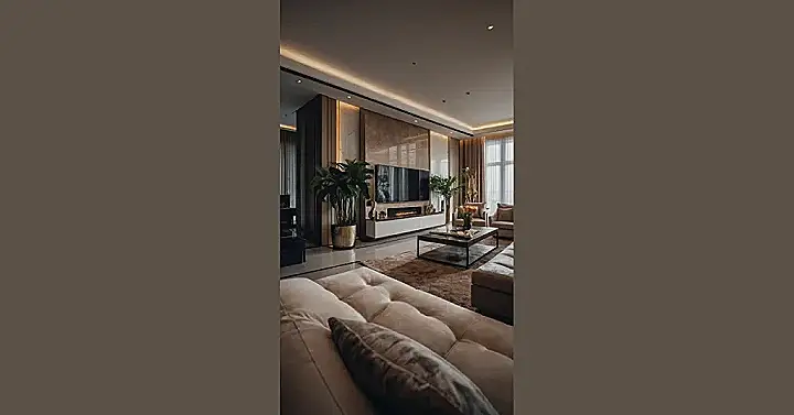 This living room is like stepping into a magazine spread! It’s all sleek lines, comfy-looking furniture, and fancy decorations. I bet it smells amazing too, like a mix of fresh flowers and maybe some expensive candles. You could totally picture yourself chilling on that big, fluffy sofa, watching a movie on the fancy TV, and pretending you live here all the time. It’s like a grown-up version of a fort, but way more sophisticated!
