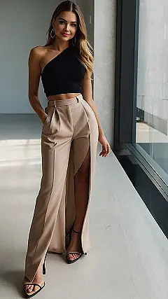 Those pants? Total boss-level. Seriously, you could wear this to school and suddenly become the person everyone asks for fashion advice. And that one-shoulder top? So cool and comfy, it’s like the dressed-up version of your favorite weekend t-shirt. Put them together and BAM! Instant classy chic status achieved.