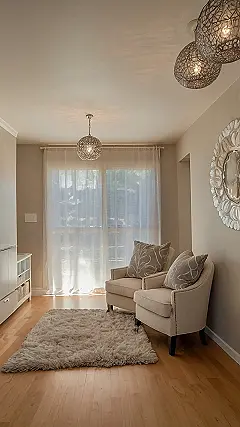 This room is like a whisper of luxury, proving you don’t need a king’s ransom to feel like royalty! Those fluffy chairs look super comfy—perfect for binge-watching your favorite shows or just chilling with a good book. The light fixtures are like fancy, sparkly jellyfish, adding a touch of elegance without breaking the bank. See? Budget-friendly doesn’t mean boring! It just means you’re smart with your money and have excellent taste.