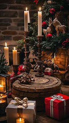 This picture is like a cozy hug on a cold winter night! Imagine settling down in this room, surrounded by flickering candlelight and the scent of pine needles. It’s a perfect winter wonderland, complete with twinkling candles, rustic wooden decor, and even a few adorable woodland creatures, ready to celebrate the holidays!