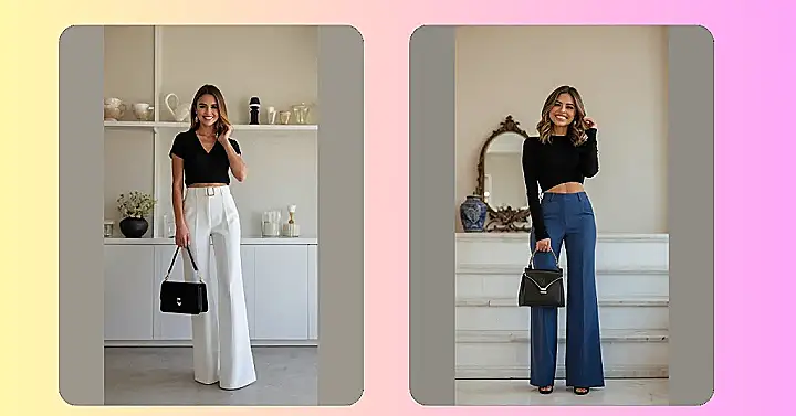 This outfit is like a secret code for looking effortlessly stylish. Imagine you’re a super-cool, grown-up version of yourself, attending a fancy event (maybe even a yacht party!). The sleek black top and those fabulously wide-legged pants are total power moves. It’s the kind of outfit that whispers “I woke up like this,” even if you spent fifteen minutes carefully choosing the perfect accessories. Seriously, those pants are calling out your name – they’re comfy, chic, and definitely worth a second look!