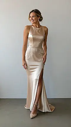 This dress is so stunning, it practically screams “engagement!” Imagine yourself gliding across the dance floor, feeling like a total princess (but way cooler than any fairytale princess, let’s be real). The sleek champagne color is perfect for showing off your glow, and that thigh-high slit adds just the right amount of “wow” factor. You’ll be the talk of the party, and not just because of your amazing engagement ring!