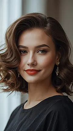 This hairstyle is seriously elegant! It’s like a perfect blend of old Hollywood glamour and modern chic. Imagine yourself at a fancy party – this medium-length, wavy look would totally make heads turn. It’s got that classic vibe, but it’s not too stuffy; it’s easy-going enough for everyday wear too, if you’re feeling extra fancy. Seriously, it makes this model look like she’s ready to accept an award for “Most Stunning Hair Ever.”