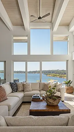 Step into this living room and you might start thinking you accidentally teleported to a fancy beach house, minus the seagulls trying to steal your snacks. It’s all bright and breezy, like the room took a deep breath of fresh ocean air (or lake air, if we’re being specific!). That giant couch is basically a super comfy island in the middle of relaxation, perfect for sprawling out and pretending your biggest worry is whether the tide will come in before you finish your Netflix binge. The view is so epic, you could probably spend hours just staring out the window, completely forgetting you have chores.