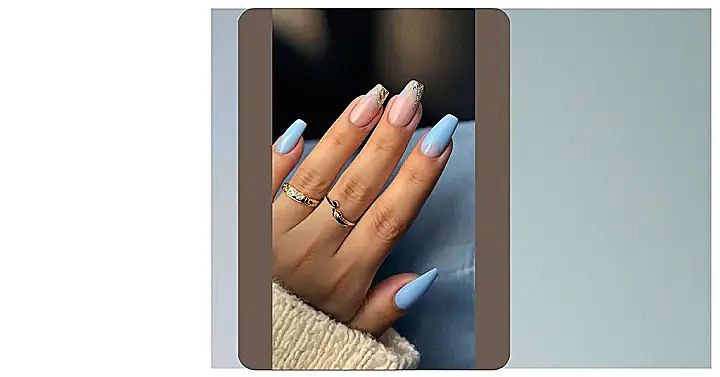 So, these nails are like if a cloud had a super fashionable makeover! We’ve got the light blue, which is giving major chill vibes, but then BAM! Sparkly accents and a rose-gold surprise. It’s like deciding between sweatpants and a party dress, and then saying, “Why not both?” Your hands will be ready for literally anything – homework, hanging with friends, or even accidentally photobombing a fancy photoshoot.