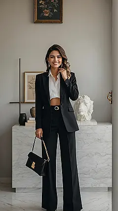 Seeing an outfit like this totally proves that professional doesn’t have to mean boring. The wide-leg pants add a cool, modern touch, and that little pop of white makes everything look super crisp. It’s the kind of look that makes you feel confident, like you could walk into any room and totally own it. Think of it as dressing the part for success, whether that’s crushing a presentation or just feeling awesome while you tackle your day.