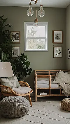 Seriously, though, that sage green paint is a dream! Combined with the warm wooden furniture and fluffy textures, it makes the whole room feel calm and peaceful. Plus, those lightbulbs hanging from the ceiling? They’re like little stars shining down on your very own nature escape! It’s the kind of space where you’d actually *want* to do your homework—maybe. Okay, definitely not *all* your homework, but at least a little bit. It’s that good.