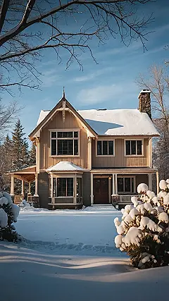 This house looks like it’s straight out of a holiday movie! Imagine cozying up inside with hot cocoa while watching the snow fall gently outside. The snowy roof is like a giant, fluffy marshmallow, and the bare branches of the trees make beautiful, wintery silhouettes against the bright blue sky. It’s the perfect winter house exterior for building a snowman family right on the front lawn—or maybe even a whole snow fort!