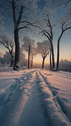 This picture is like a winter wonderland straight out of a fairytale! Just imagine walking down this snowy path with the sun shining through the trees, making the whole world sparkle. It looks so peaceful and quiet, you can almost hear the crunch of snow under your boots.