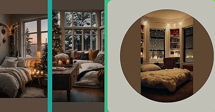 The twinkle lights add a magical touch, like something out of a fairy tale. And don’t even get me started on those furry throw pillows! They look so comfy, I’m ready to dive right in. It’s basically the definition of cozy, and perfect for a winter wonderland escape!