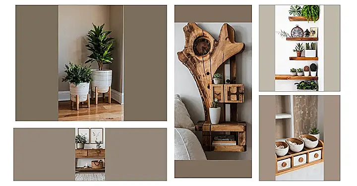 This isn’t your grandma’s corner shelf—unless your grandma’s super cool and into stylish home decor! Check out this awesome wooden number, perfectly showcasing some seriously cute plants. It’s like a mini-zen garden for your room, proving that even small spaces can have big style. Those little succulents and pine cones add a touch of nature’s whimsy, making it the perfect example of how wooden home decor items can brighten up any corner.
