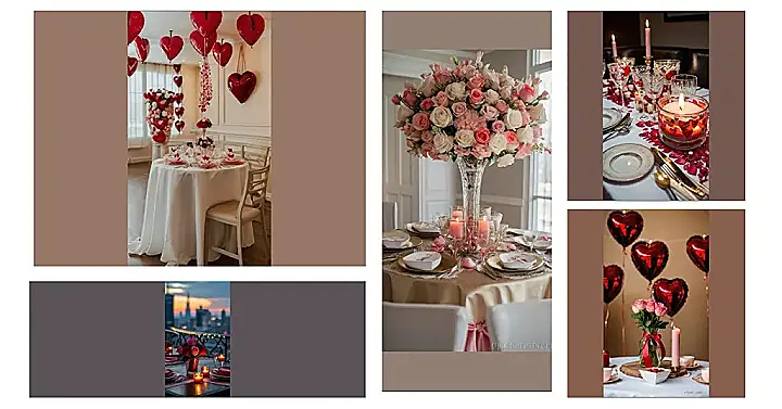 Setting the scene for a Valentine’s Day dinner is all about romance, right? Forget stuffy formality! This table is super cute with its rosy pink roses and heart-shaped balloons – like a party just exploded with love! Those little raspberries look delicious too, perfect for a sweet treat before the main course. Imagine how much fun it would be to pop all those balloons after dinner!