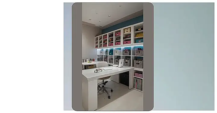 So, you’re looking at this picture and thinking, “Is this a super organized office, or a craft explosion waiting to happen?” Well, it’s both! This craft room office is like the mullet of workspaces – business up front with your laptop and homework, and party in the back with all your art supplies. Just try not to glue your keyboard to your science project – we’ve all been there!