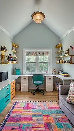 This craft room office is seriously goals! Imagine having a space that’s half creative chaos and half productive zone. You could be churning out masterpieces one minute and acing your history assignment the next. Plus, that colorful rug? It’s like a party for your feet!